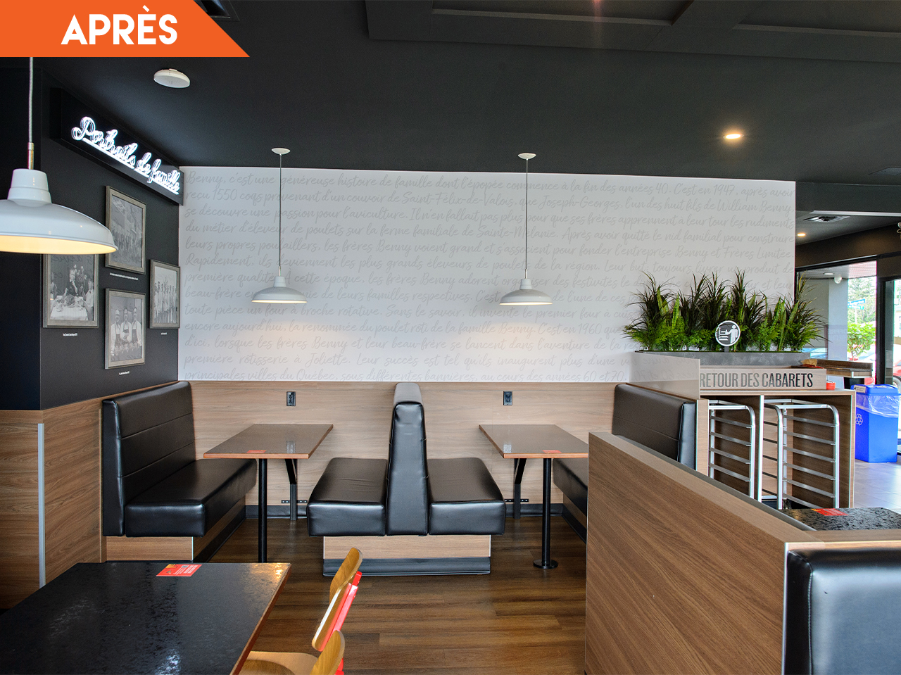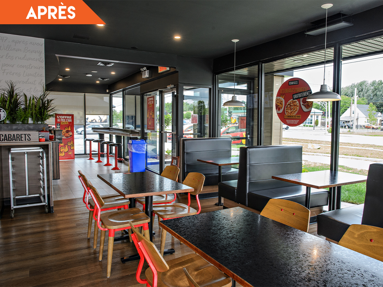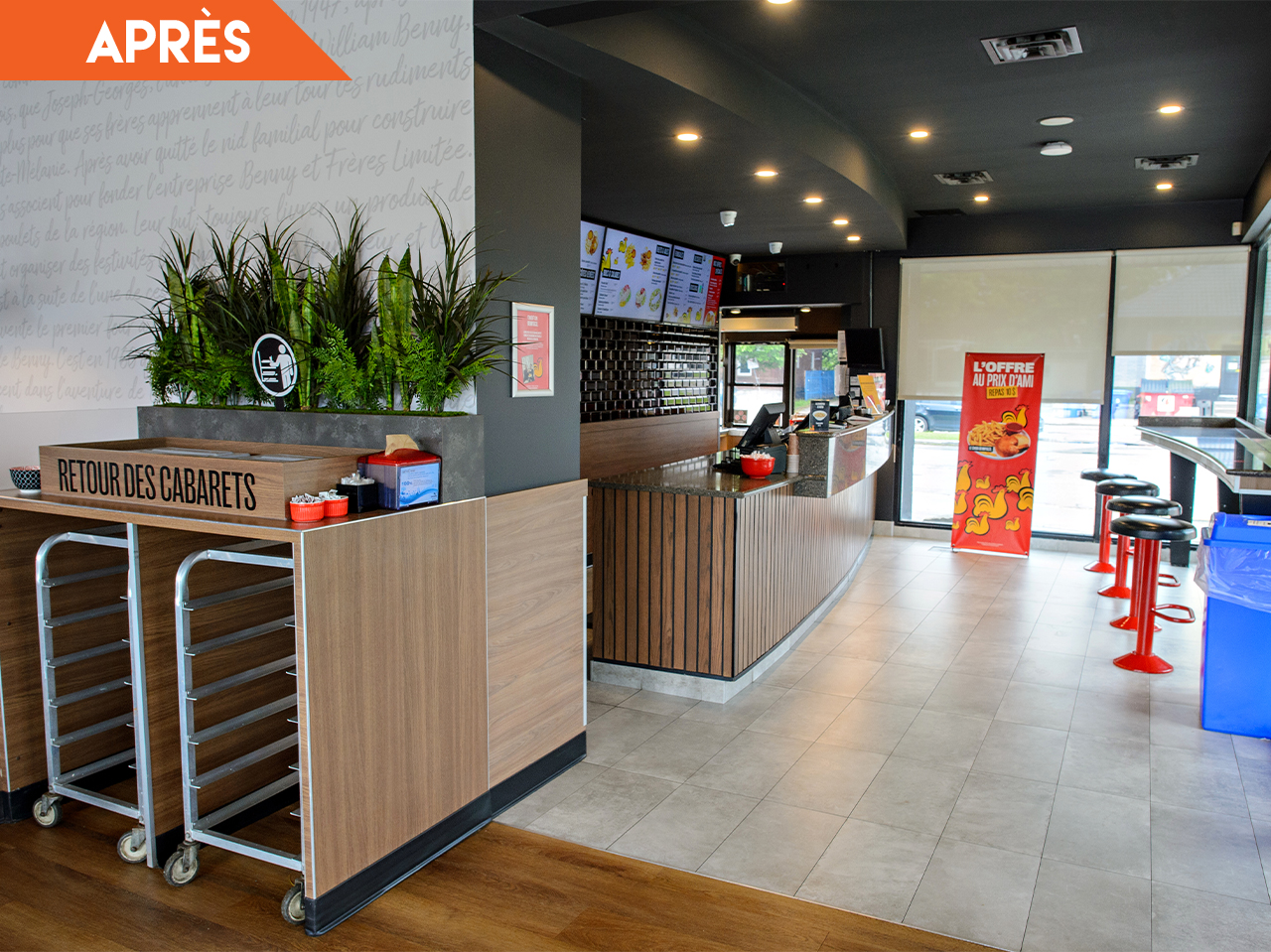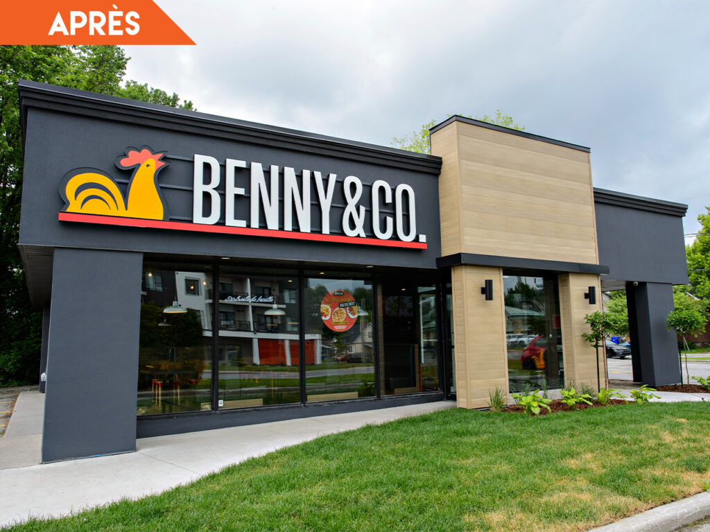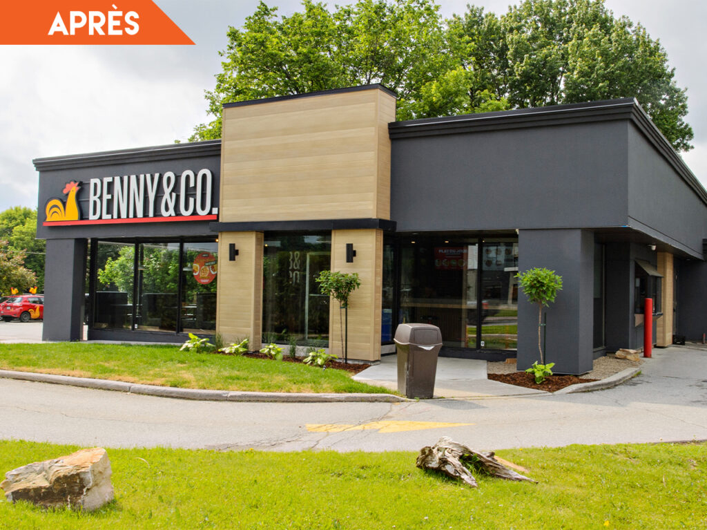 Fondée en 1960, la chaîne québécoise de rôtisseries Benny & Co. continue d’investir dans la modernisation de ses établissements. Pour la succursale du boulevard Maloney, DLS Construction a réalisé une rénovation complète, incluant la transformation de la salle à manger, le remplacement du comptoir-caisse, la remise à neuf des salles de toilette et la rénovation partielle de la cuisine, notamment avec l’ajout d’une nouvelle laverie. À la différence d’autres succursales, ce projet comprenait aussi une modernisation complète de l’enveloppe extérieure : nouvelles façades, revêtements, éclairage extérieur, réaménagement du service au volant et installation de bornes numériques pour un service plus interactif. Comme pour d’autres projets similaires, les travaux ont été effectués sans interruption des opérations, exigeant une planification rigoureuse et des mesures de confinement strictes pour limiter poussière, bruit et odeurs.