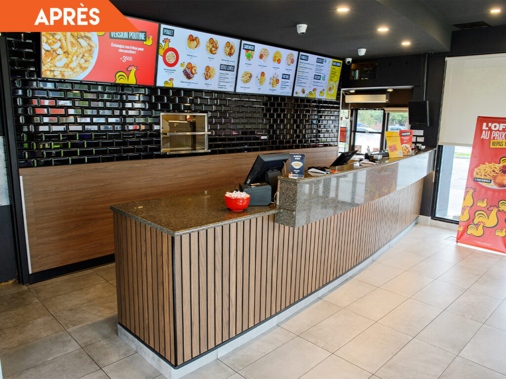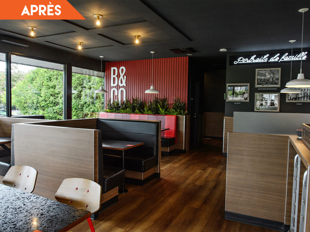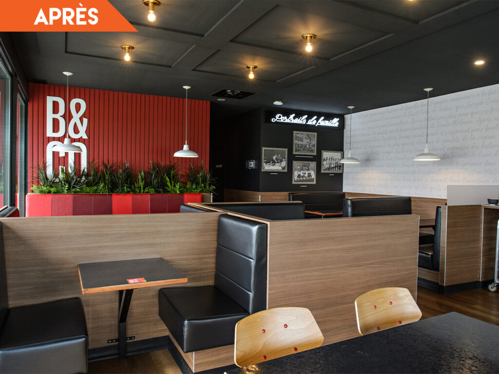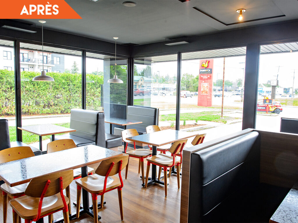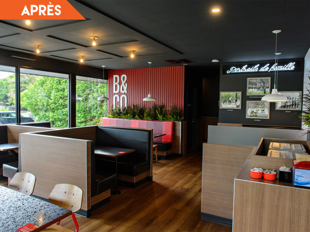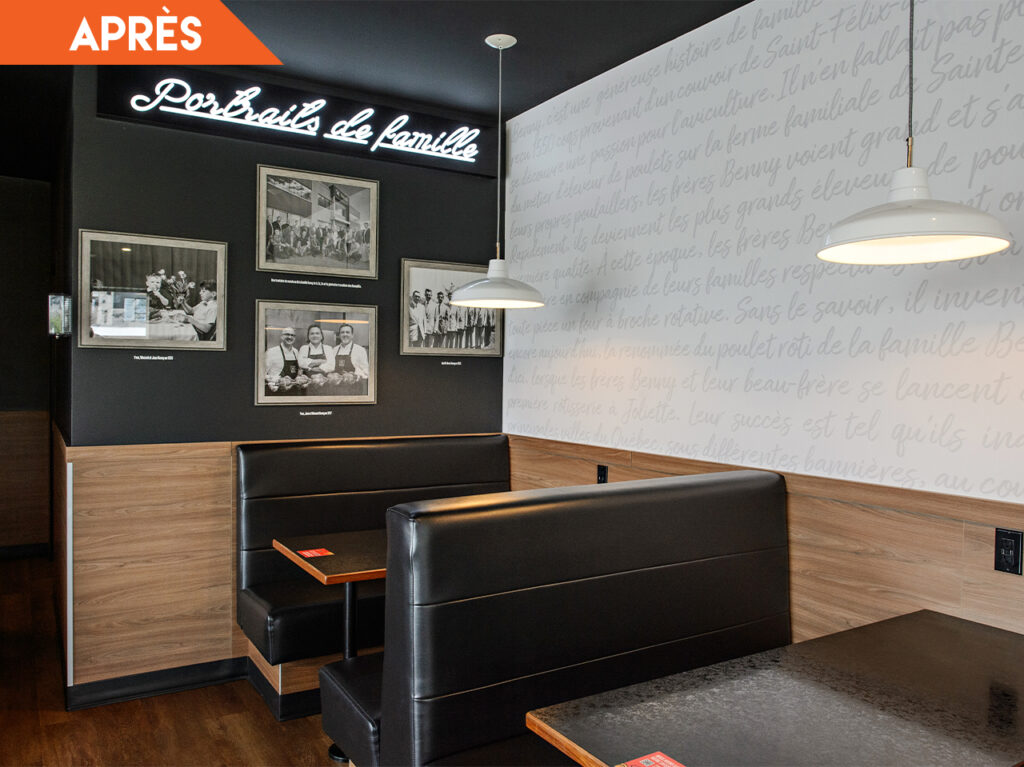 Fondée en 1960, la chaîne québécoise de rôtisseries Benny & Co. continue d’investir dans la modernisation de ses établissements. Pour la succursale du boulevard Maloney, DLS Construction a réalisé une rénovation complète, incluant la transformation de la salle à manger, le remplacement du comptoir-caisse, la remise à neuf des salles de toilette et la rénovation partielle de la cuisine, notamment avec l’ajout d’une nouvelle laverie. À la différence d’autres succursales, ce projet comprenait aussi une modernisation complète de l’enveloppe extérieure : nouvelles façades, revêtements, éclairage extérieur, réaménagement du service au volant et installation de bornes numériques pour un service plus interactif. Comme pour d’autres projets similaires, les travaux ont été effectués sans interruption des opérations, exigeant une planification rigoureuse et des mesures de confinement strictes pour limiter poussière, bruit et odeurs.