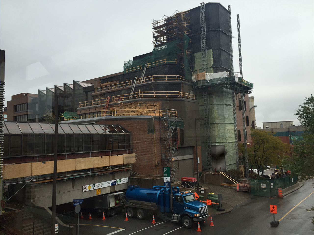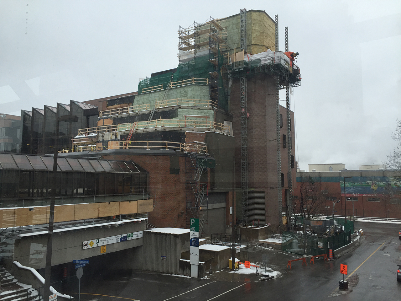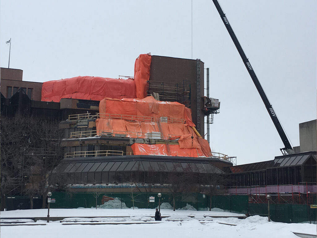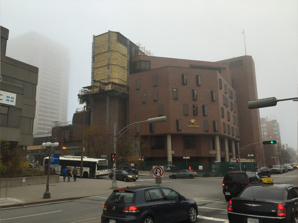 Symbole civique majeur, la Maison du citoyen est aussi l’hôtel de ville de Gatineau, où siègent les instances municipales et de nombreux services administratifs. Fait intéressant : une passerelle vitrée relie directement le bâtiment à la Place du Portage, facilitant l’accès entre les deux pôles gouvernementaux. DLS Construction a piloté la quatrième phase de la réfection des façades, ciblant l’aile sud-ouest, incluant la tour de neuf étages et ses étages adjacents en escalier. Le chantier a mobilisé plusieurs expertises : maçonnerie, vitrages, toiture et réfection de la verrière de la passerelle. Les travaux ont été réalisés dans un bâtiment occupé à 100 %, ce qui a exigé des mesures strictes de contrôle du bruit, des poussières et des odeurs, particulièrement autour des systèmes de ventilation. Un autre défi notable : l’installation de panneaux de granite chauffants avec un système d’ancrage sur mesure sur les parapets, pour prévenir l’accumulation de neige et les glissements de glace en hiver.