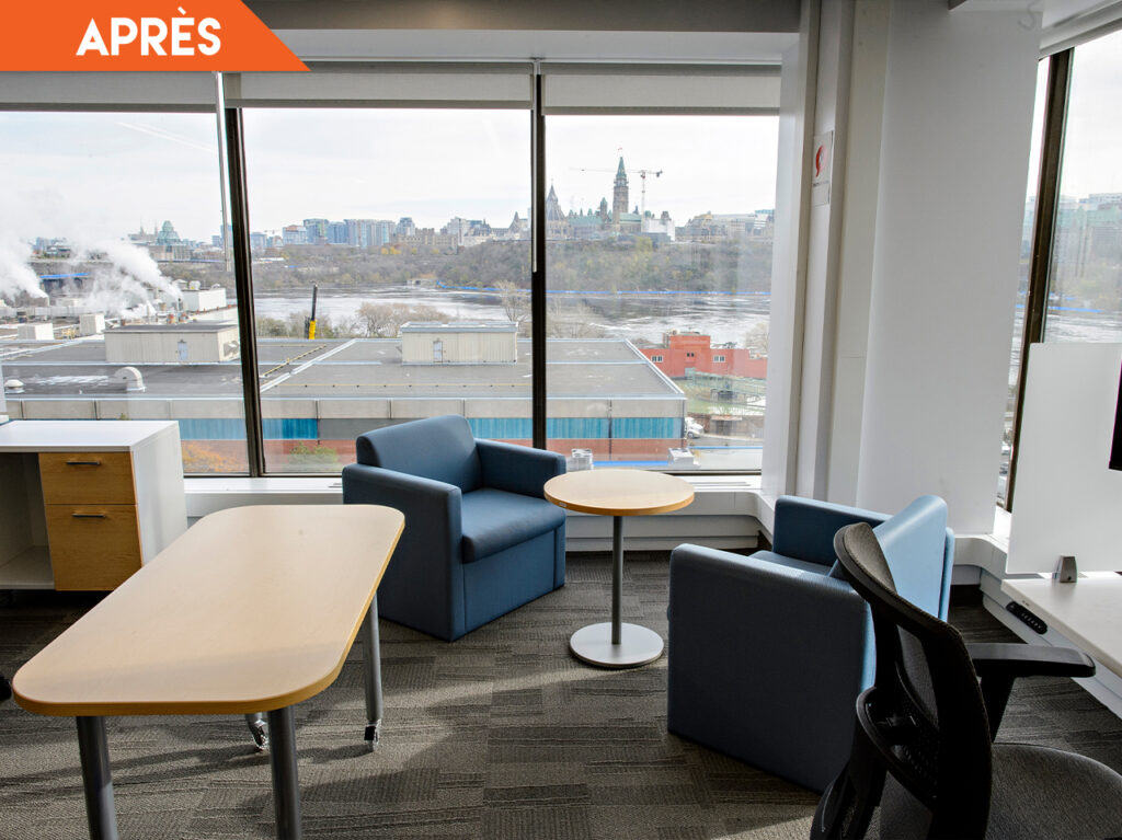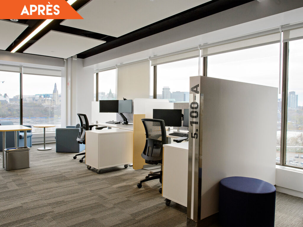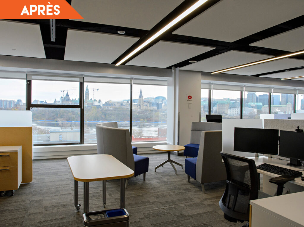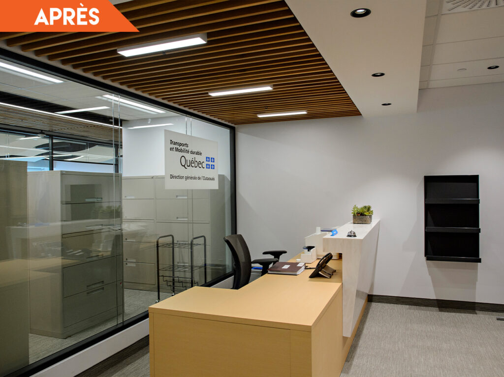 Situé en plein centre-ville de Gatineau, l’édifice abritant le ministère des Transports a fait l’objet d’un réaménagement complet de son 5e étage. Dans une volonté d’évolution vers des milieux de travail plus dynamiques, DLS Construction a converti les bureaux conventionnels en espaces 2.0 à aire ouverte, favorisant la collaboration, la flexibilité et le partage. Ce type d’aménagement est de plus en plus adopté dans les ministères provinciaux pour favoriser l'efficacité et le bien-être au travail. Le principal défi du projet résidait dans sa logistique : les travaux ayant lieu en hauteur, et les ascenseurs étant trop petits, tous les matériaux et équipements ont dû être transportés par grue; une opération délicate et réglementée, surtout en pleine zone urbaine.