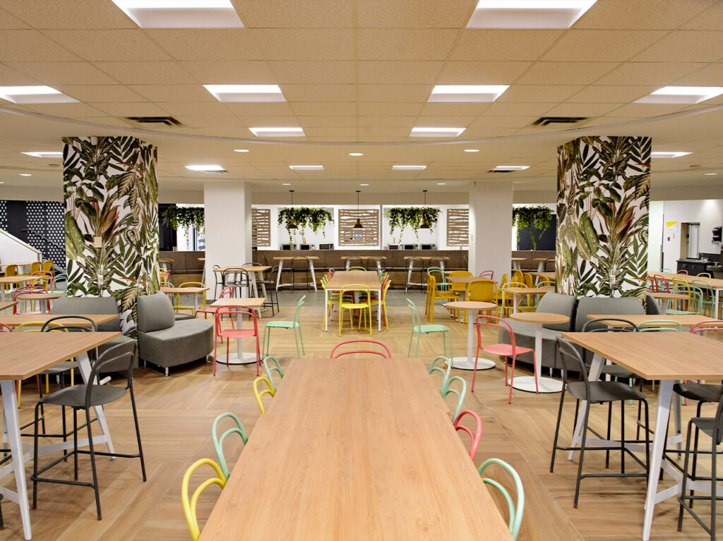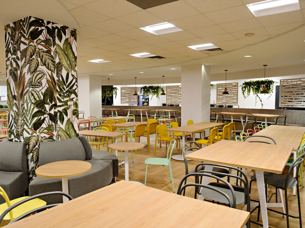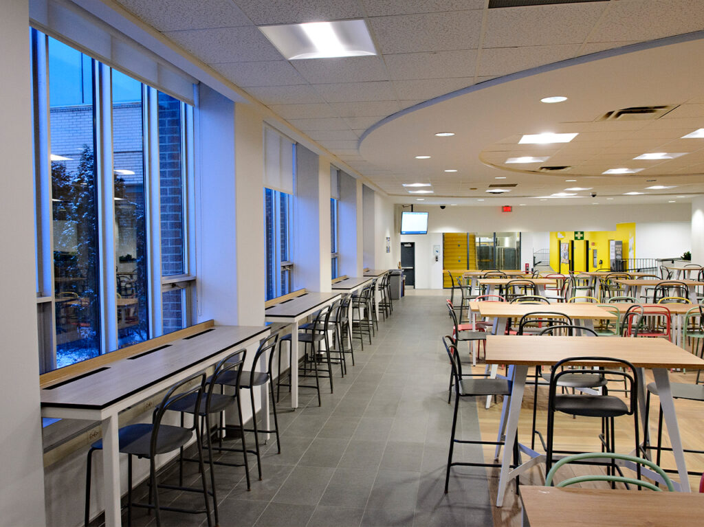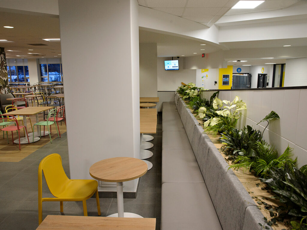 Le pavillon Lucien-Brault est l’un des bâtiments les plus fréquentés du campus de l’Université du Québec en Outaouais, abritant entre autres les services étudiants et plusieurs salles de cours. DLS Construction y a réalisé une rénovation complète de la cafétéria, débutant par la démolition de l’ancien aménagement, incluant le retrait des tables et chaises fixées au sol. Un nouveau plancher à motif attrayant a été installé, sur lequel repose un mobilier coloré, comprenant de longues banquettes, des panneaux muraux végétalisés et d’imposantes colonnes habillées de papier peint contemporain.