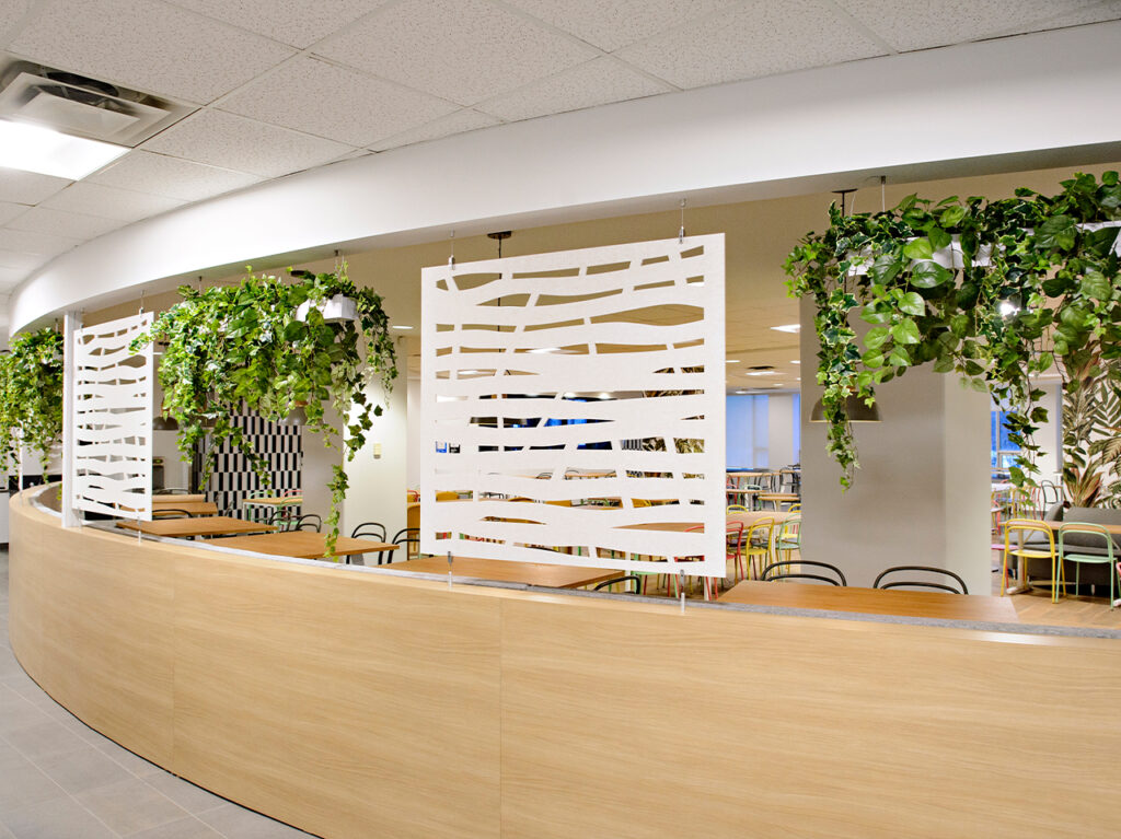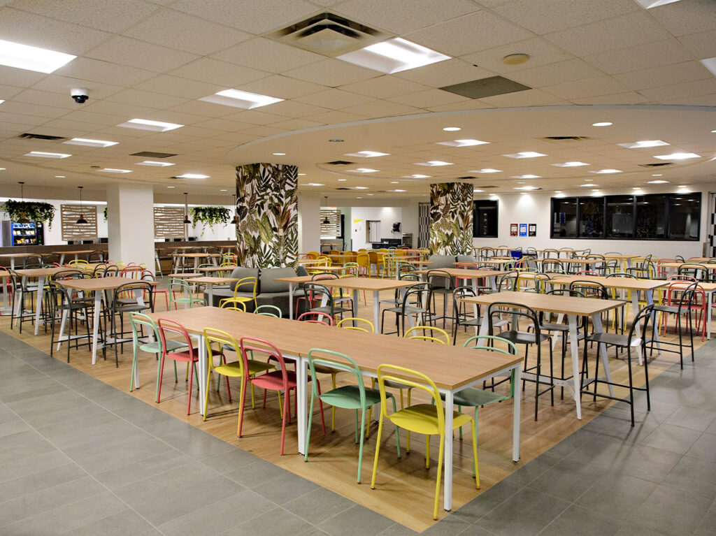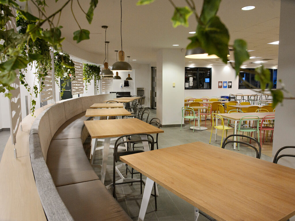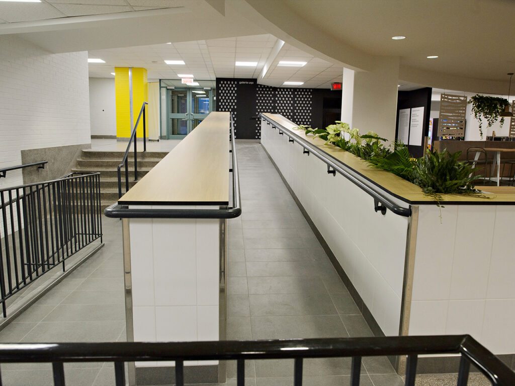 Le pavillon Lucien-Brault est l’un des bâtiments les plus fréquentés du campus de l’Université du Québec en Outaouais, abritant entre autres les services étudiants et plusieurs salles de cours. DLS Construction y a réalisé une rénovation complète de la cafétéria, débutant par la démolition de l’ancien aménagement, incluant le retrait des tables et chaises fixées au sol. Un nouveau plancher à motif attrayant a été installé, sur lequel repose un mobilier coloré, comprenant de longues banquettes, des panneaux muraux végétalisés et d’imposantes colonnes habillées de papier peint contemporain.